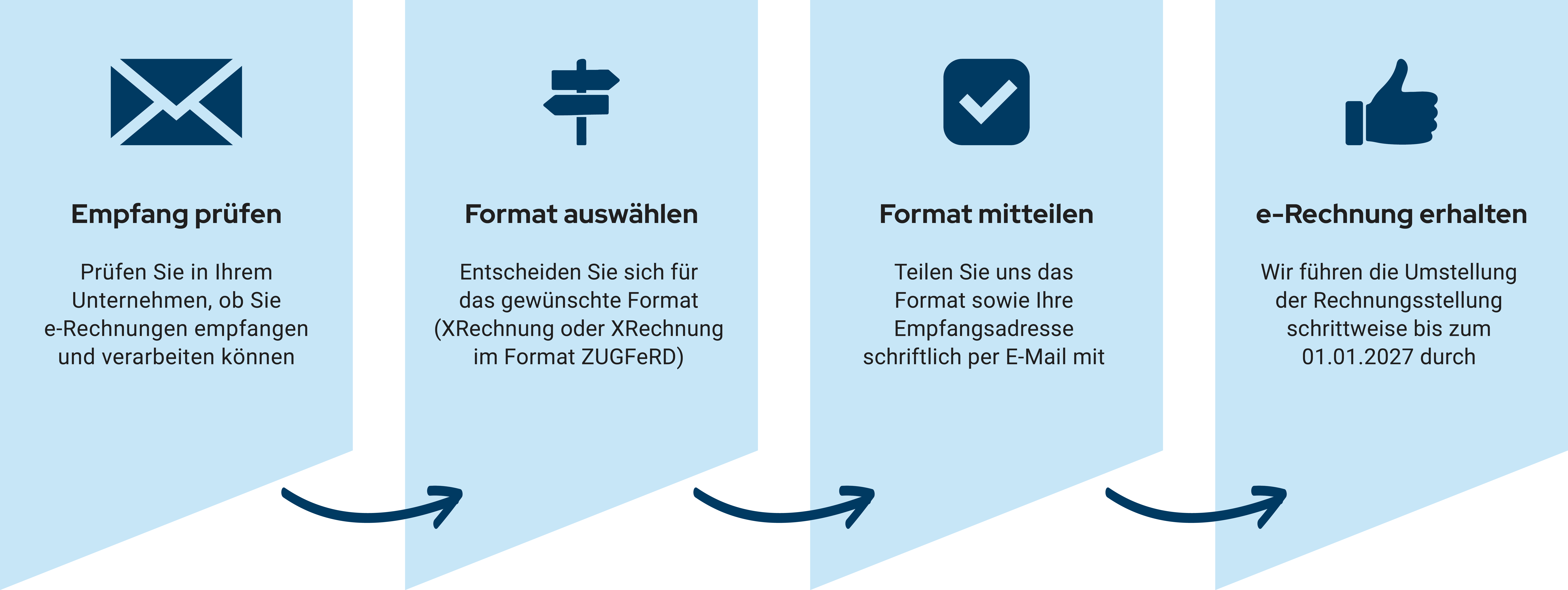 Die E-Rechnung wird Ihnen per E-Mail an die von Ihnen angegebene Empfangsadresse zugeschickt. Sie erhalten sie als maschinenlesbare XML-Datei der unterstützten Rechnungsformate im Anhang der E-Mail.